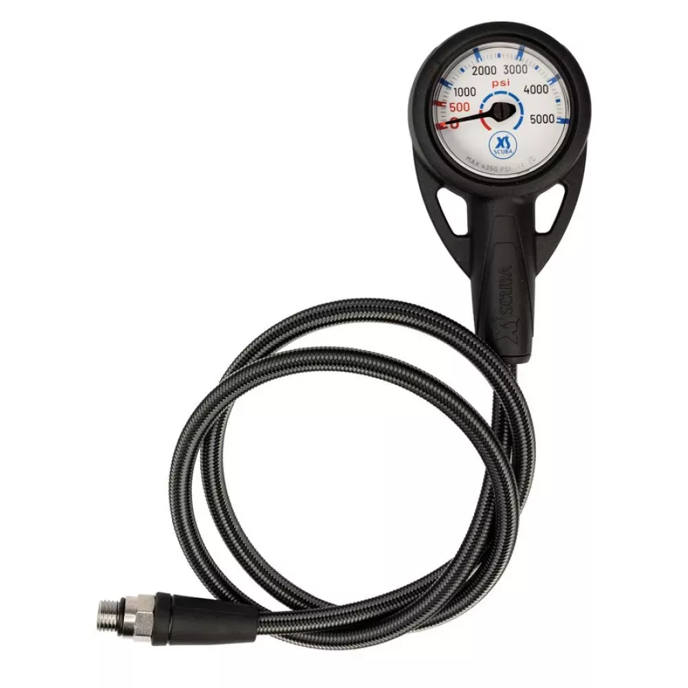 A streamlined single pressure gauge with a dual PSI/BAR scale and a carbon fiber braided hose. Built lighter and thinner than traditional SPGs, it provides accurate tank pressure readings with reduced bulk and drag.
